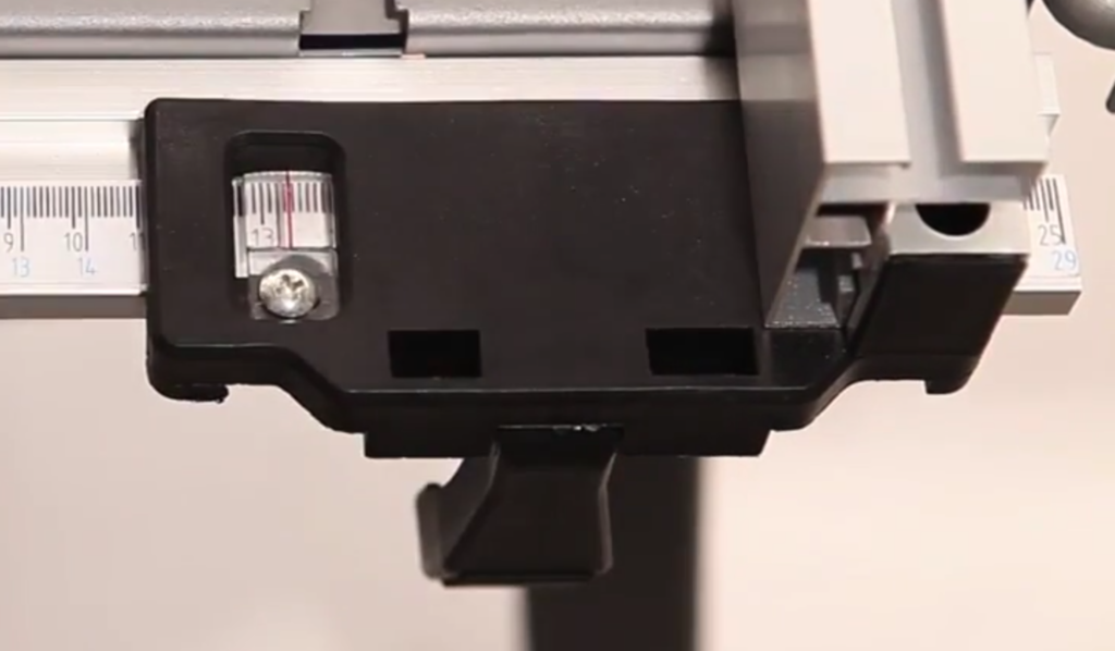 Auch der Winkelanschlag bedarf zu Beginn an einer kleinen Korrektur. Dabei müssen Sie den kleinen “Metallzeiger” etwas nachjustieren, sodass dieser genau auf die Gradangabe zeigt.